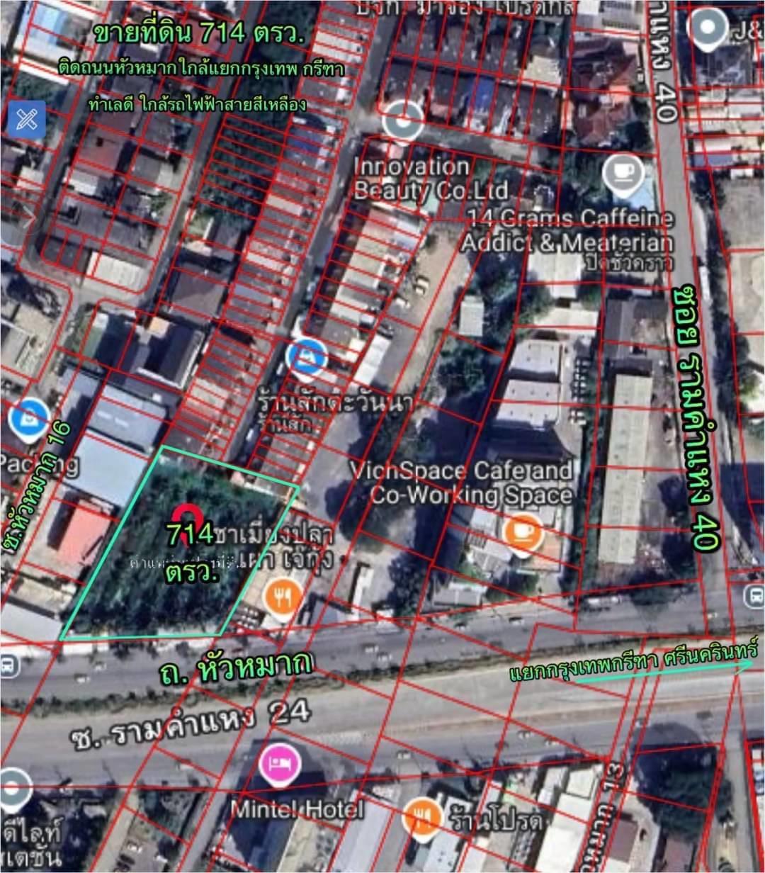 R68-065ขายที่ดิน 714 ตรว.ติดถนนหัวหมาก ที่ดินใจกลางหัวหมาก กรุงเทพกรีฑา อยู่ระหว่างซอยหัวหมาก16กับซอยรามคำแหง14 ทำเลดีผังเมืองสีส้ม ห่างจากแยก