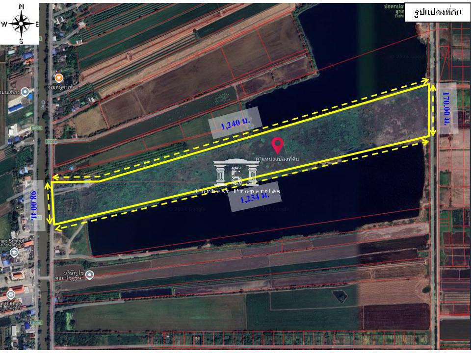 เนื้อที่ 100ไร่ ด้านติดถนนกว้าง 98 เมตร ลึก 1,240 เมตร ถนนด้านหน้าที่ดินกว้าง 6 เมตร พื้นที่สีชมพู