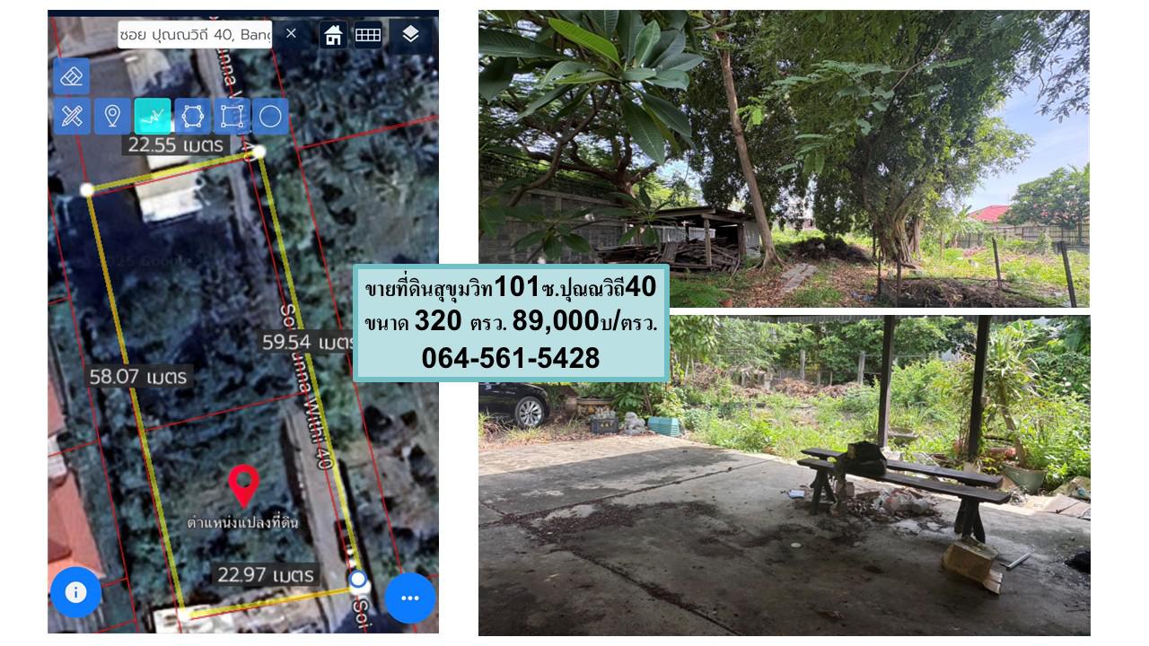 ขายที่ดินสุขุมวิท101 ปุณณวิถี40 89,000 ต่อ ตารางวา ที่ดินสวยขนาด 320 ตารางวา หน้ากว้าง 59 เมตร ลึก 23เมตร