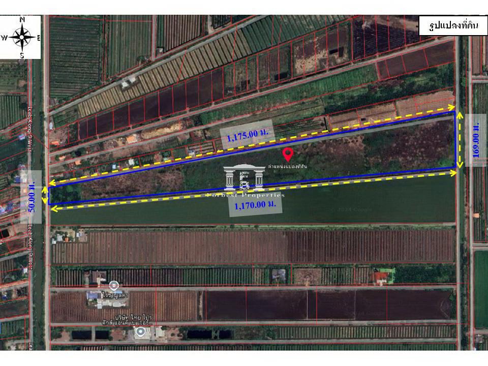 เนื้อที่ 85-3-30 ไร่ ด้านติดถนนกว้าง 50 เมตร ลึก 1,170 เมตร ถนนด้านหน้าที่ดินกว้าง 16 เมตร พื้นที่สีชมพู