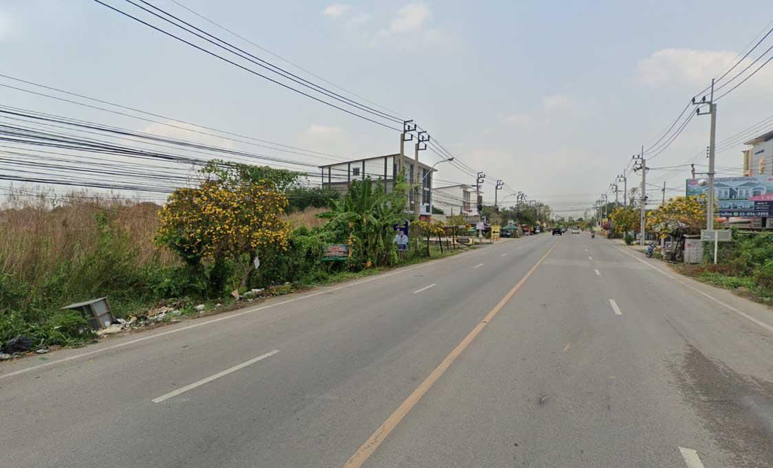 ที่ดินติดถนนสายบ้านกล้วย-ไทรน้อย หน้ากว้างด้านติดถนนประมาณ 82 เมตร ยาวประมาณ 572 เมตร ด้านหลังกว้างประมาณ 124 เมตร ระดับของที่ดินเกือบเท่ากับระดับของถนน