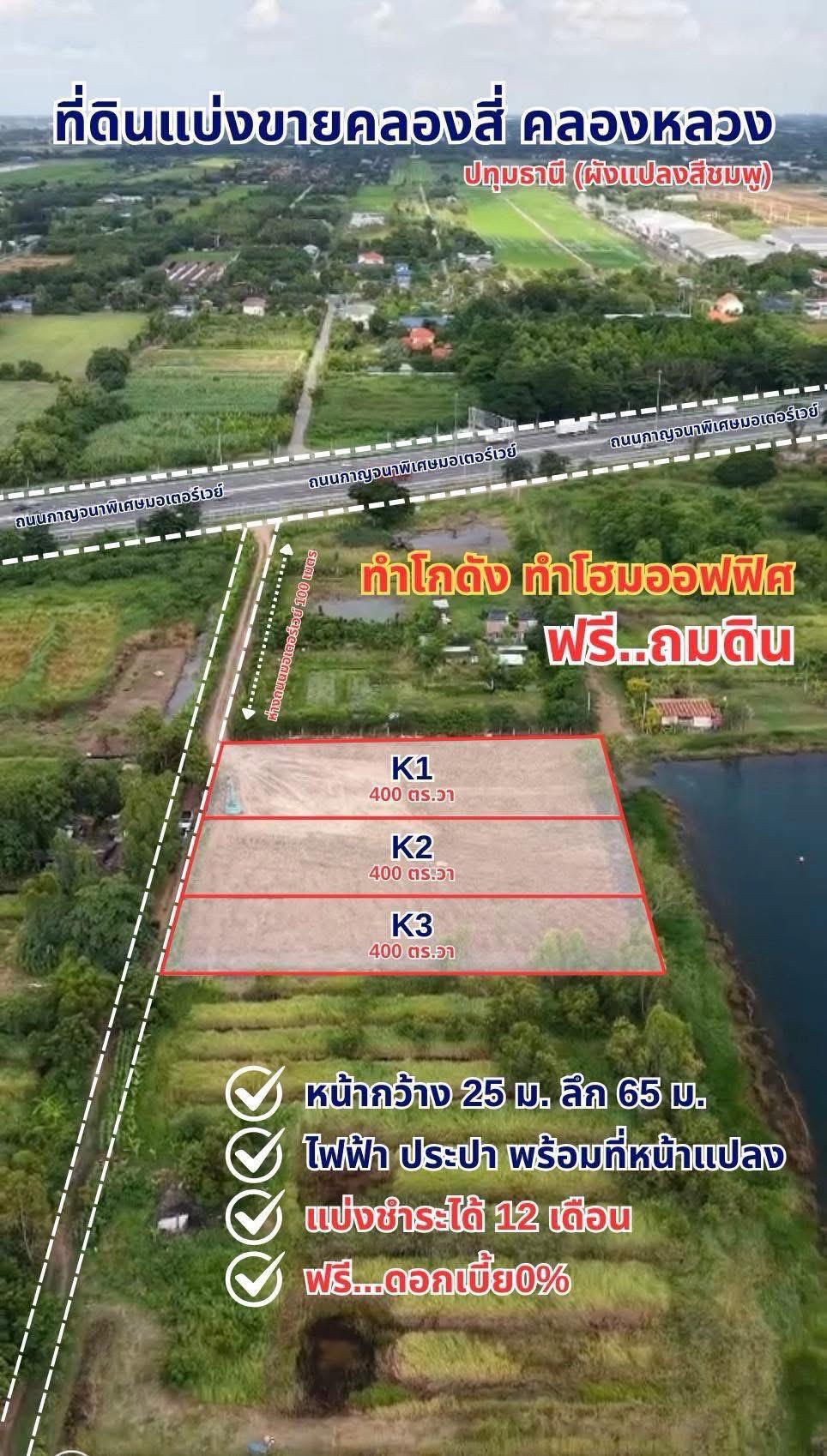 #ที่ดินสวยคลองสี่ คลองหลวง ปทุมธานี 3 ไร่ ถมแล้ว ใกล้มอเตอร์เวย์เพียง 100 เมตร ใกล้ขนส่งปทุมธาณี ถนนหน้าแปลงกว้างถึง 10 เมตร เดินทางสะดวก มี 3 ไร่ แบ่งขาย1 ไร่ๆล่ะ 2.9 ลบ ฟรีโอนให้ทั้งหมด