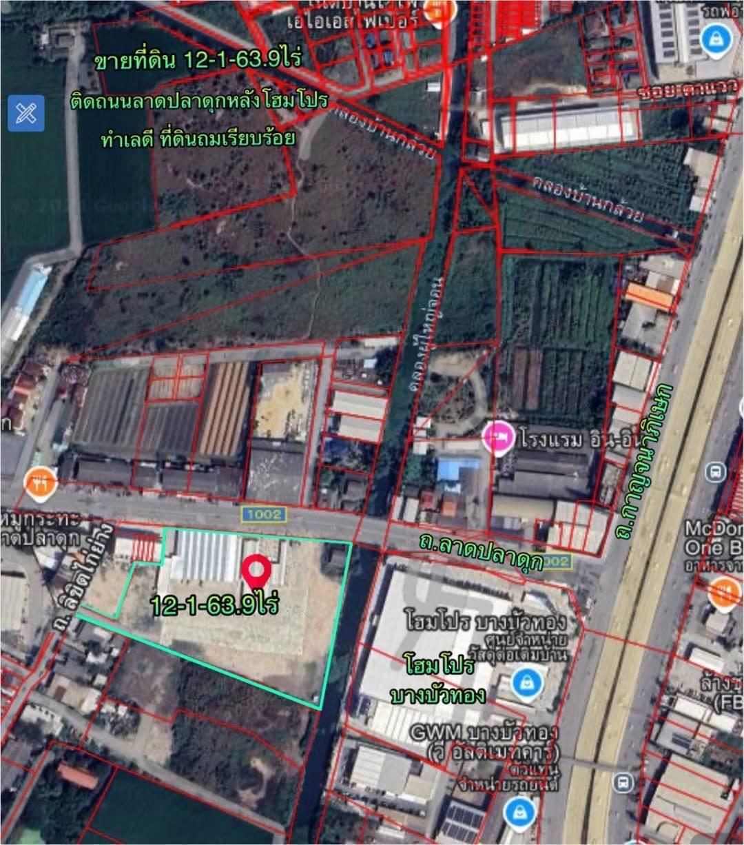 R068-044ขายที่ดิน 12-1-63.9 ไร่ติดถนนลาดปลาดุกหลังโฮมโปรบางบัวทองห่างจากถนนกาญจนาภิเษกเพียง100กว่าเมตร ทำเลดี ที่ดินถมแล้วทั้งแปลง