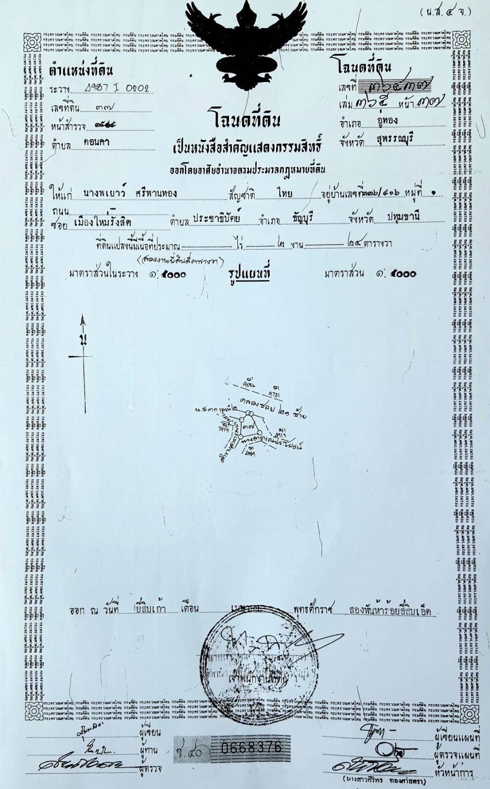 ที่ดิน (โฉนด) เนื้อที่ 2-2-0 ไร่ โฉนดเลขที่ 38600 ต.ดอนคา อ.อู่ทอง จ.สุพรรณบุรี