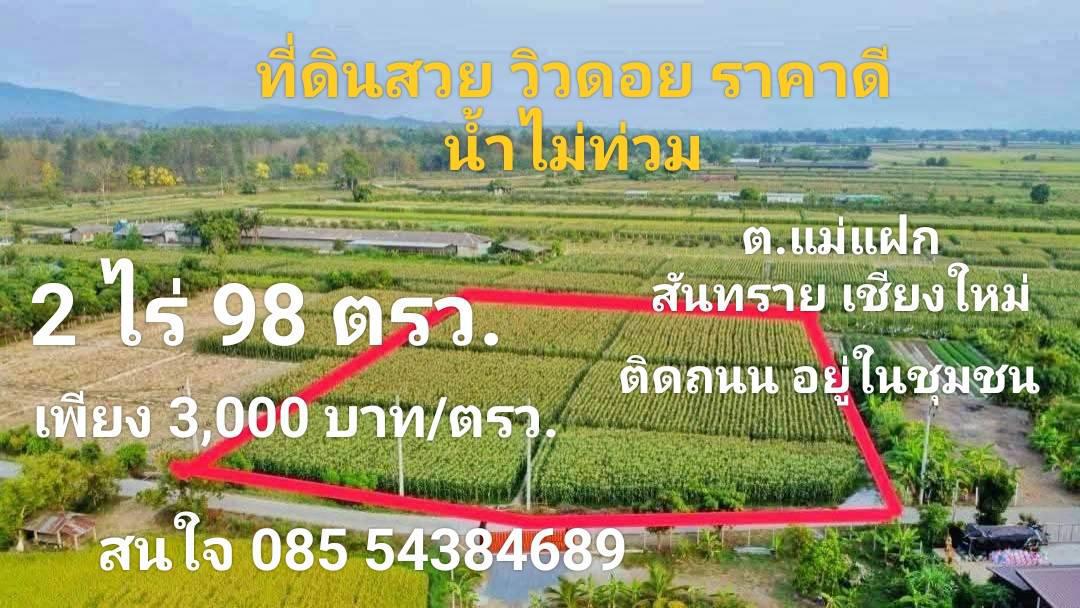 ขายที่ดินสันทราย 2 ไร่กว่าทำเลดีติดถนนน้ำไฟถึง ตรว.ละ 3,000 เท่านั้น บรรยากาศดีวิวดอยโอบล้อม น้ำไม่ท่วมากาศดีมีว