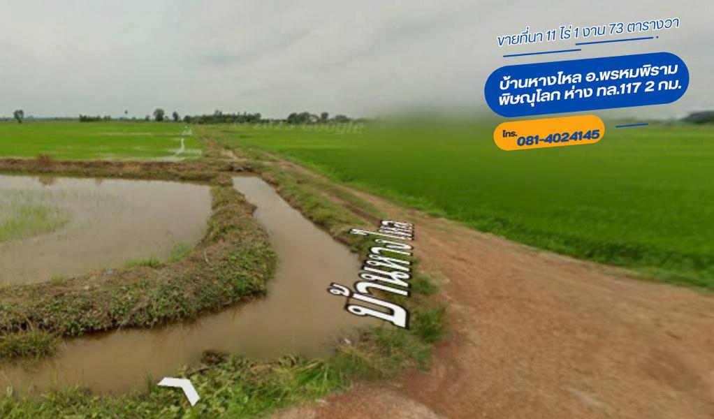 ขายที่นา 11 ไร่ บ้านหางไหล อ.พรหมพิราม พิษณุโลก ห่าง ทล.117 2 กม.