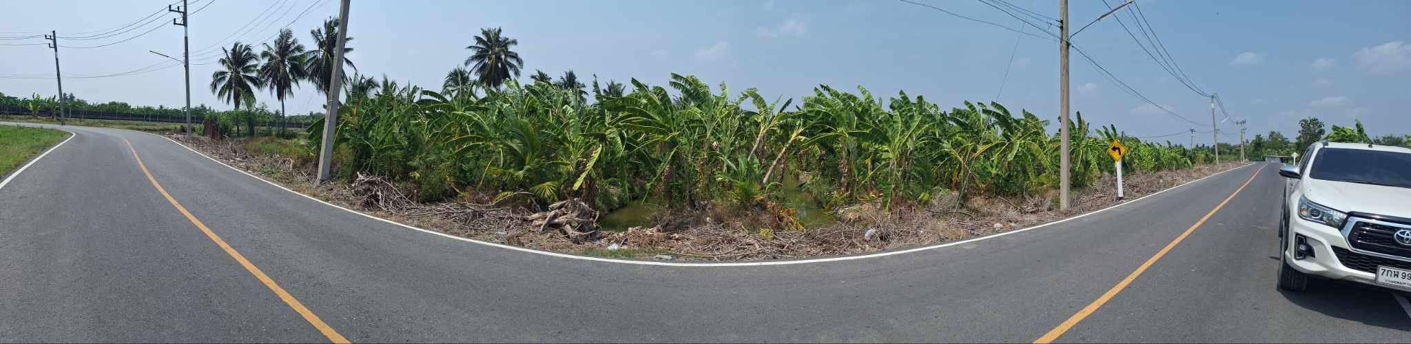 ที่ดินทำสวนมะพร้าว กล้วย 6 ไร่ 309 วา แปลงหัวมุม หน้ากว้างติดถนน 140 เมตร ลึกประมาณ 100 เมตร