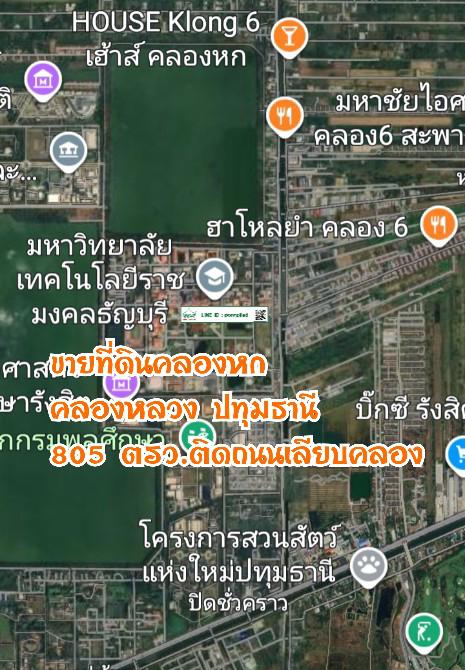 ขายที่ดินคลองหก คลองหลวง 805 ตรว. ติดถนนเลียบคลอง ใกล้มหาวิทยาลัย สวนสัตว์