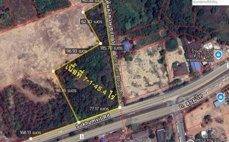 ขายที่ดินติดถนนสุขุมวิทต.เพ จ.ระยองติดถนน 2 ด้าน เนื้อที่รวม 3 แปลง 7-1-43.4 ไร่