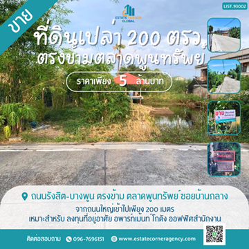 ขายที่ดิน 200 ตรว. ถนนรังสิต-บางพูน ตรงข้าม ตลาดพูนทรัพย์ ซอยบ้านกลาง