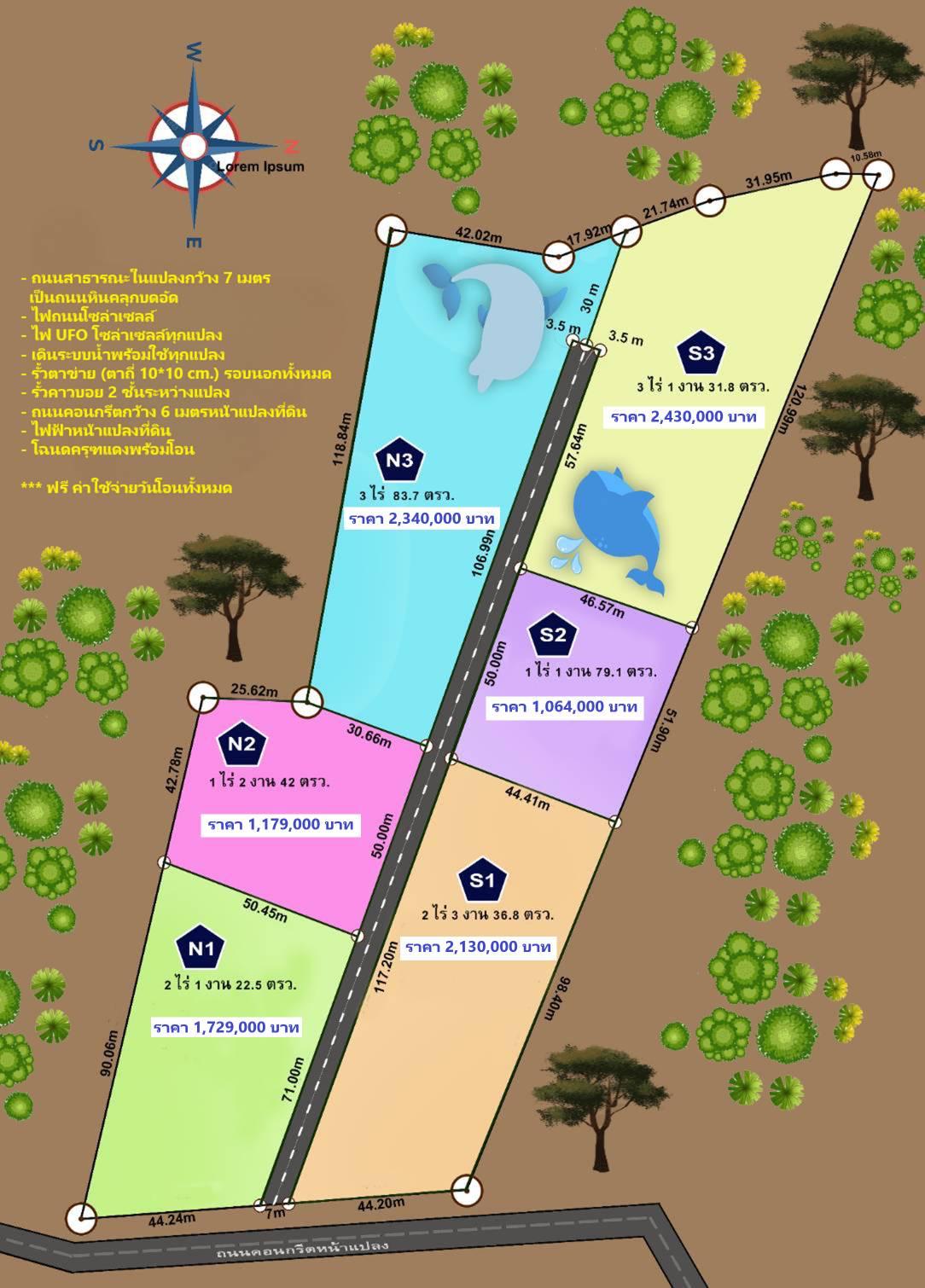 แปลง N 1 เนื้อที่ 2 ไร่ 1 งาน 22.5 ตรว. ติดถนนสาธารณะคอนกรีต และติดถนนสาธารณะหินคลุก ราคา 1,729,000 บาท