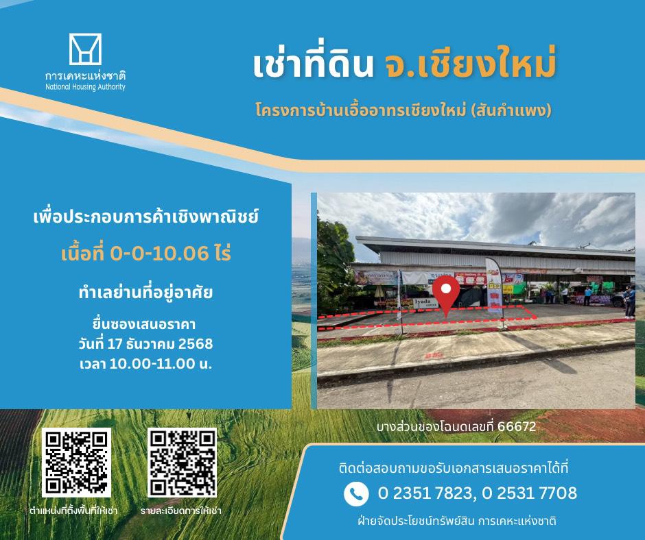 ด้วย การเคหะแห่งชาติ มีความประสงค์ให้ผู้สนใจยื่นข้อเสนอประมูลราคาค่าธรรมเนียมการได้สิทธิเช่าพื้นที่เพื่อประกอบการค้าเชิงพาณิชย์ ในโครงการบ้านเอื้ออาทรเชียงใหม่ (สันกำแพง) บางส่วนของโฉนดเลขที่ 66672 เนื้อที่ 0-0-10.06 ไร่ โดยมีรายละเอียด ดังนี้