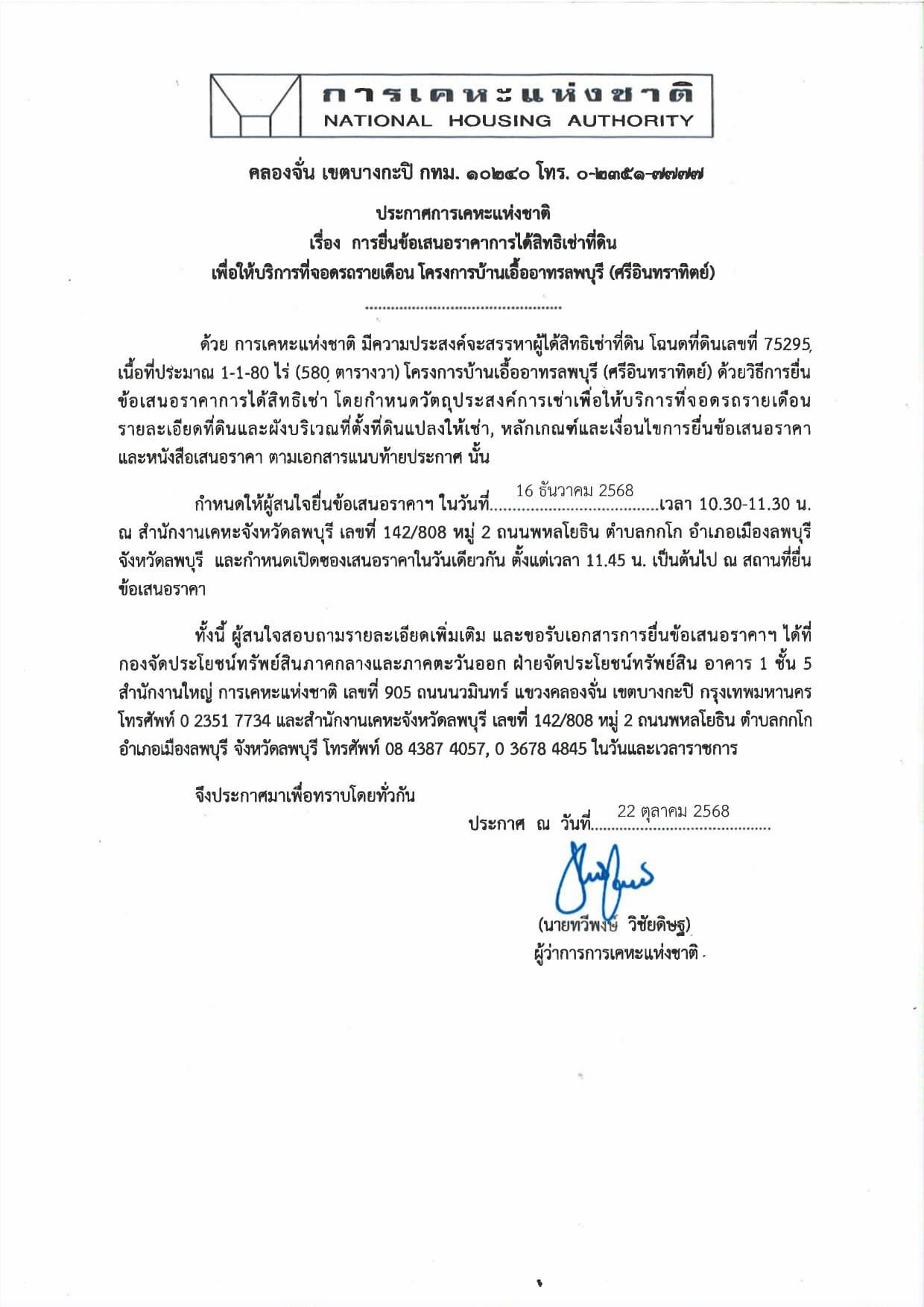 ด้วย การเคหะแห่งชาติ มีความประสงค์จะสรรหาผู้ได้สิทธิเช่าที่ดิน โฉนดที่ดินเลขที่ 75295 เนื้อที่ประมาณ 1-1-80 ไร่ (580 ตารางวา) โครงการบ้านเอื้ออาทรลพบุรี (ศรีอินทราทิตย์) ด้วยวิธีการยื่นข้อเสนอราคาการได้สิทธิเช่า โดยกำหนดวัตถุประสงค์การเช่าเพื่อให้บริการที่จอดรถรายเดือน