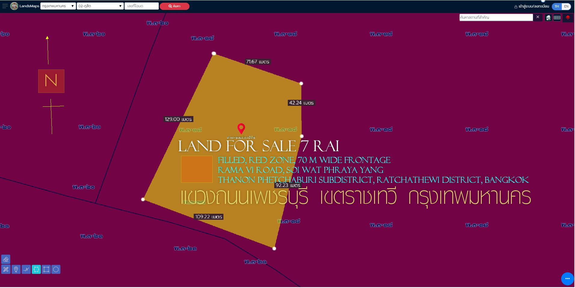 ขายที่ดิน 7ไร่ ถมแล้ว พื้นที่สีแดง หน้ากว้าง 70ม. ถนนพระราม 6 วัดพระยายัง แขวงถนนเพชรบุรี เขตราชเทวี กรุงเทพมหานคร