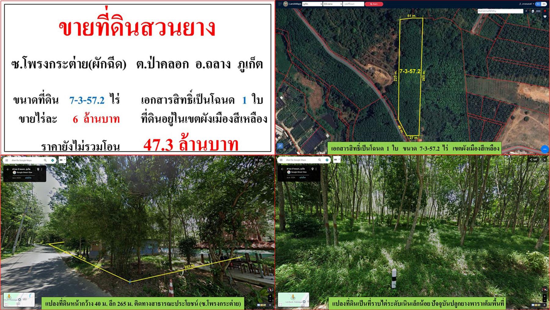 ขายที่ดินสวนยาง ขนาด 7-3-57.2 ไร่ ซ.โพรงกระต่าย(ผักฉีด) ต.ป่าคลอก อ.ถลาง ภูเก็ต