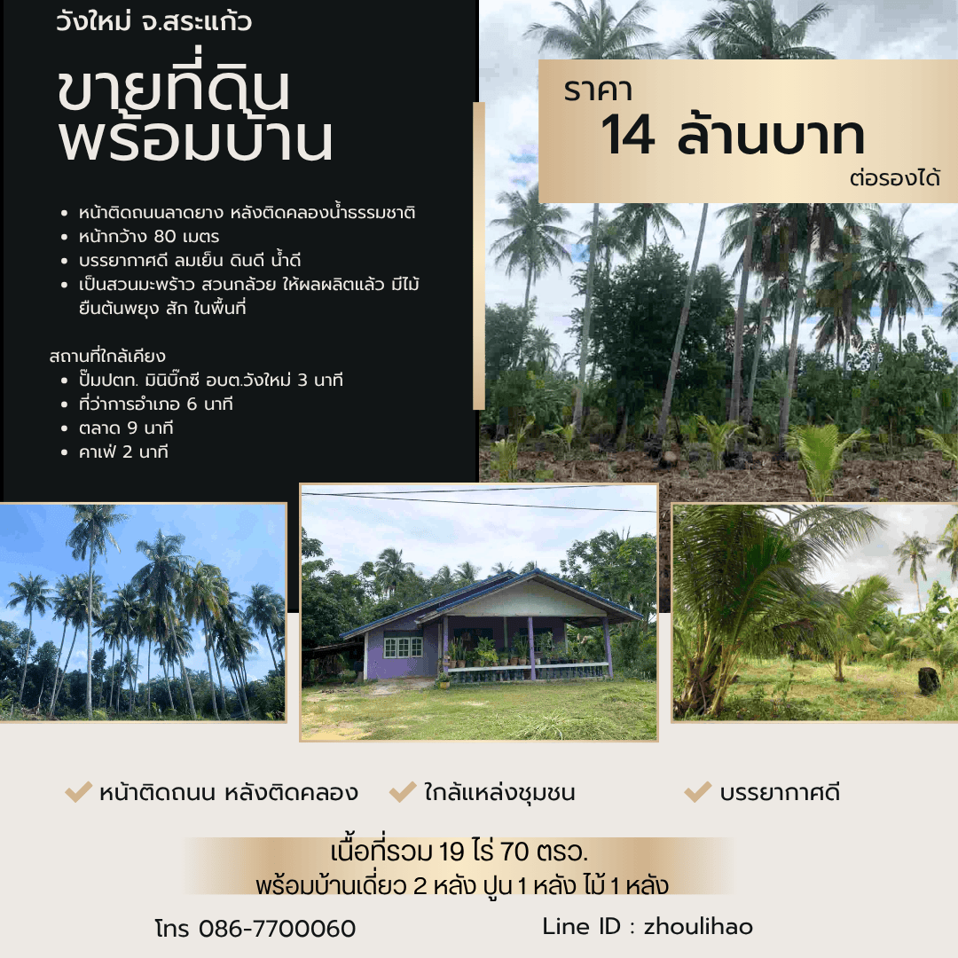 ขายที่ดินพร้อมบ้าน 19 ไร่ วังใหม่ จ.สระแก้ว