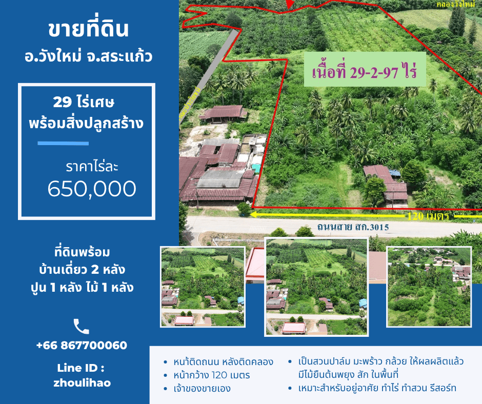 ขายที่ดิน 29 ไร่เศษ พร้อมสิ่งปลูกสร้าง วังใหม่ จ.สระแก้ว