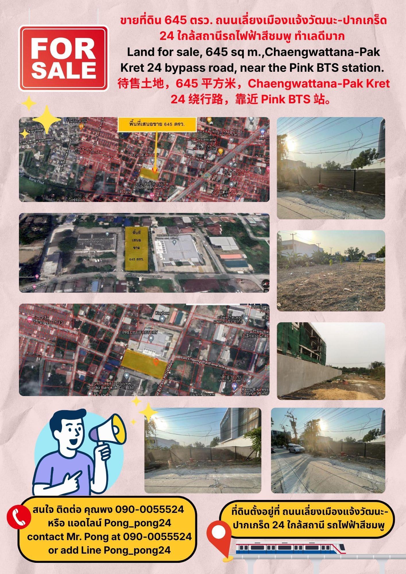 待售土地,645 平方米,Chaengwattana-Pak Kret 24 绕行路,靠近 Pink BTS 站。