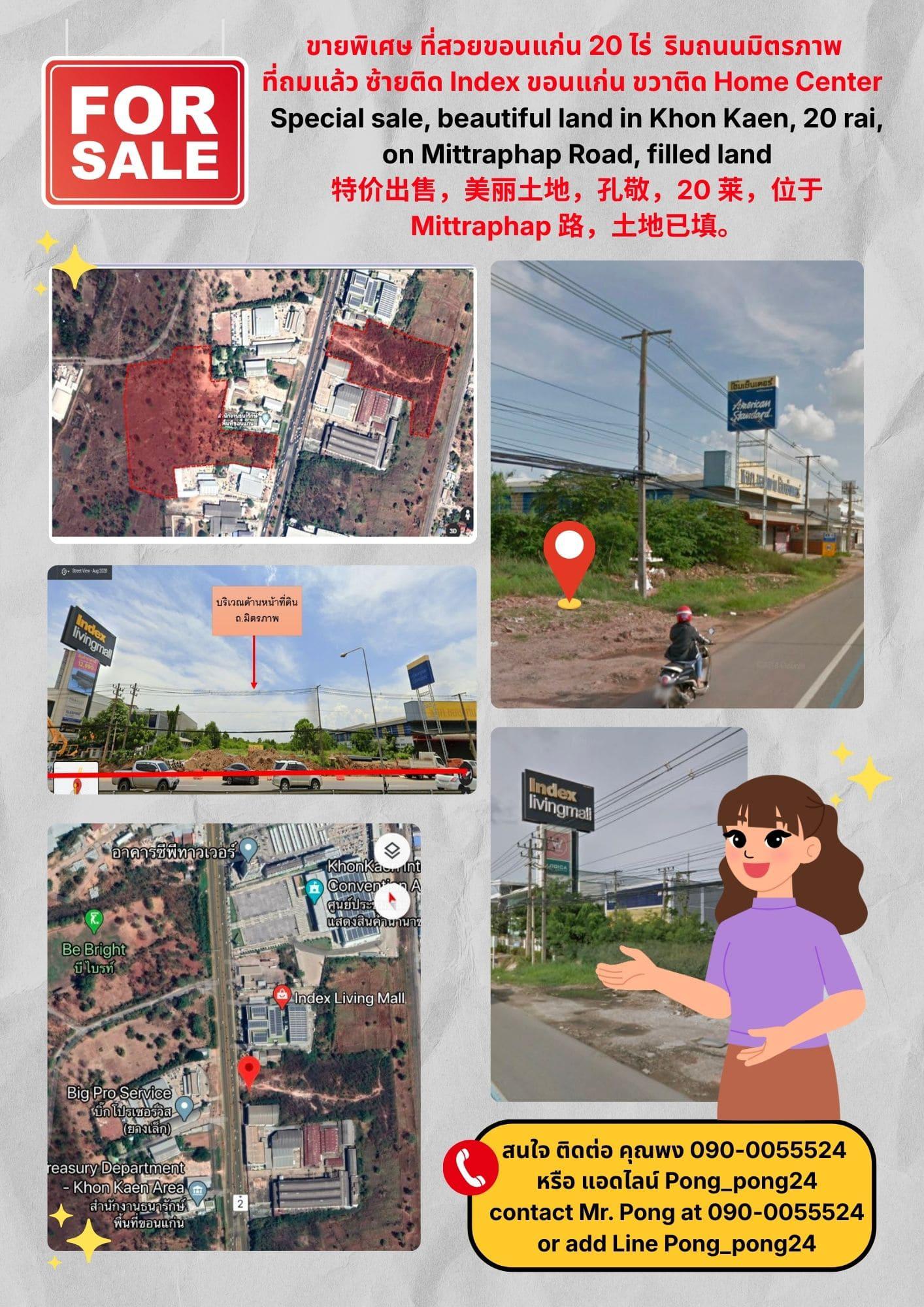 ขายพิเศษ ที่สวยขอนแก่น 20 ไร่ ติด Index ขอนแก่น ริมถนนมิตรภาพ ที่ถมแล้ว ซ้ายติด Index ขอนแก่น ขวาติด บริษัท โฮมเซ็นเตอร์ ตรงข้ามเป็น Big Pro Service เนื้อที่ 20 ไร่ เหมาะทำ โชว์รูม โรงเรียน ห้าง