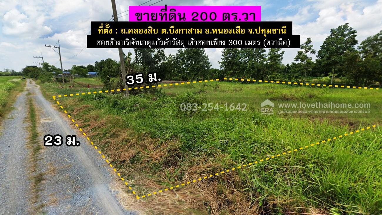 ขายด่วนที่ดิน 200 ตรว. ใกล้วัดเจริญบุญ ถ.คลองสิบ ซอยบริษัทเกตุแก้วค้าวัสดุ หนองเสือ ปทุมธานี เข้าซอยเพียง 300 เมตร (ขวามือ) หน้ากว้าง 23 ม. ลึก 35 ม.