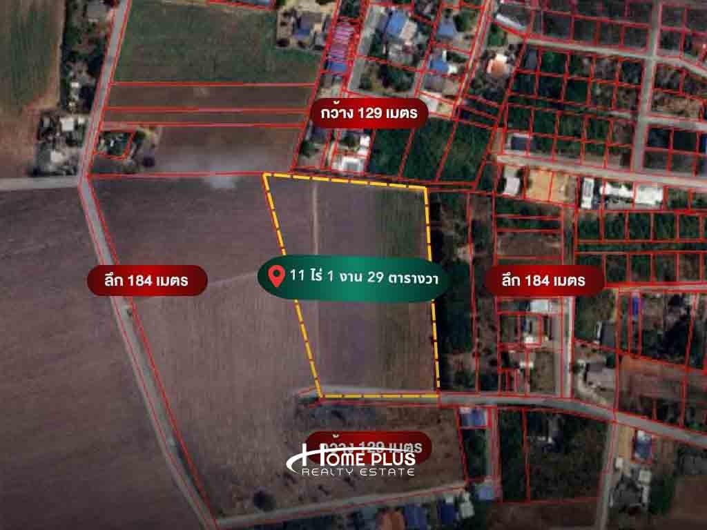 เนื้อที่ 11 ไร่ 1 งาน 29.0 ตารางวา l กว้าง 129 เมตร l ลึก 184 เมตร l หันหน้าไปทางทิศตะวันออก