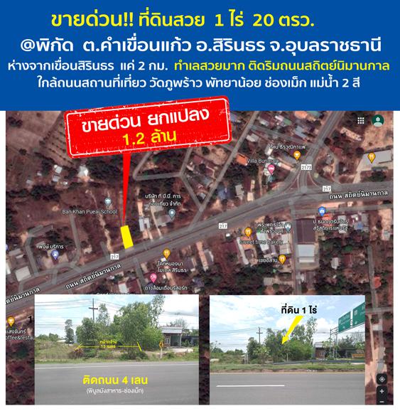ที่ดินสวย ติดถนน 4 เลน ***ปลอดภัยจากแผ่นดินไหว น้ำไม่ท่วม*** พิบูลมังสาหาร-ช่องเม็ก เขตชุมชน ต.คำเขื่อนแก้ว อ.สิรินธร จ.อุบลราชธานี เหมาะสร้างบ้าน ทำเลธุรกิจ ระยะทางจากจากตัวอำเภอสิรินธร แค่ 2.5 กิโลเมตร จากเขื่อนสิรินธร 2 กิโลเมตร
