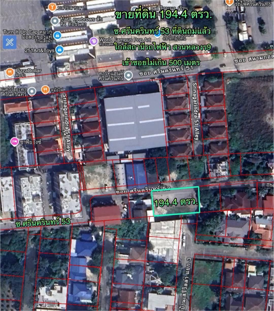 R68-022ขายที่ดิน 194.4 ตรว.ซอยศรีนครินทร์ 53 เข้าซอยไม่เกิน 500 เมตร ที่ดินรูปสวยสี่เหลี่ยมผืนผ้า ถมแล้ว ถนนซอยกว้าง 8เมตร ที่ดินอยู่สถานีรถไฟฟ้าสวนหลวง ร9 เพียง500 เมตรทั้งยังอยู่