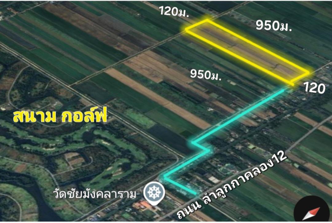 ลำลูกกาคลอง 12. (71 ไร่ ไร่ละ 1.3 ล้าน ) หน้ากว้าง.120 เมตร ลึก 950 เมตร นาเดิม