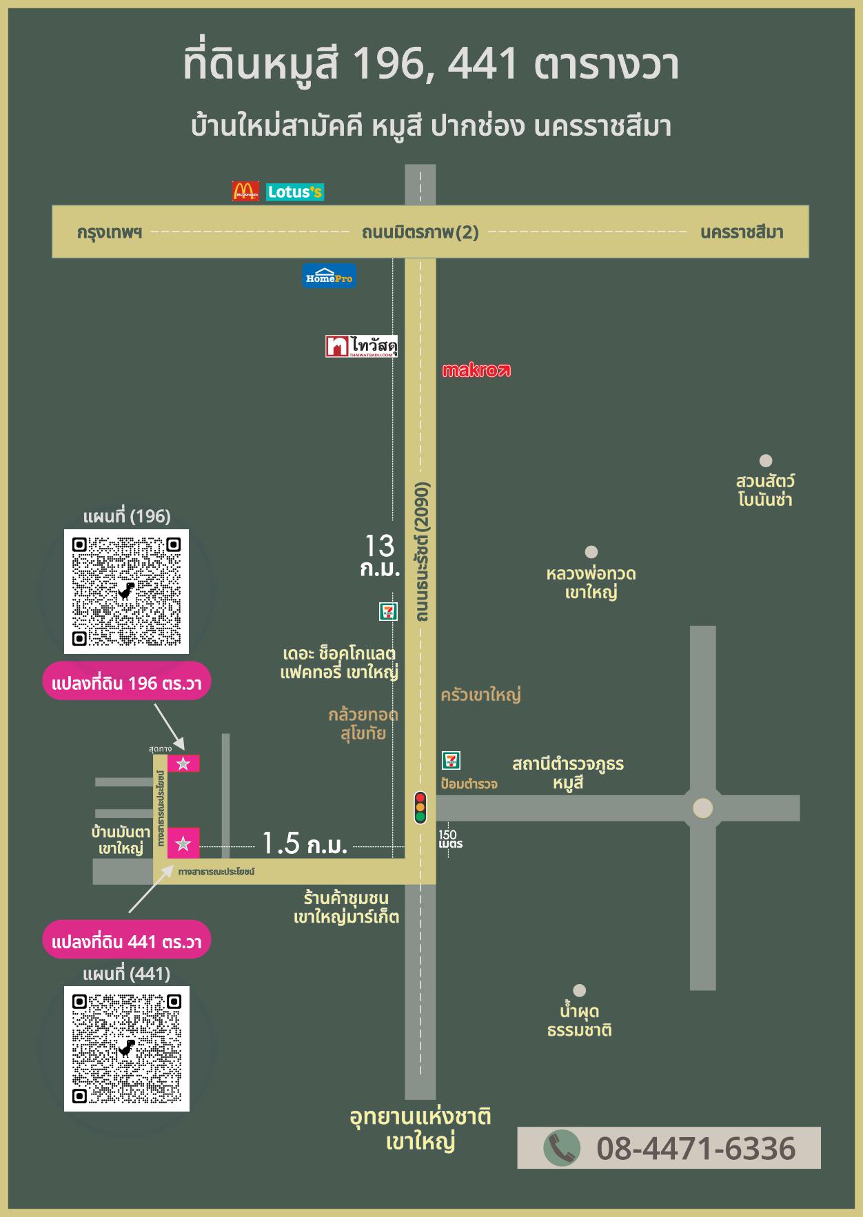 ที่ดินเขาใหญ่-หมูสี 196-441 ตร.วา ใกล้ถ.ธนะรัชต์ กม.13.5 ต.หมูสี อ.ปากช่อง จ.นครราชสีมา T.084-4716336