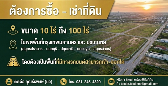 ต้องการซื้อ – เช่าที่ดิน ขนาด 10 ไร่ ถึง 100 ไร่ ในเขตพื้นที่กรุงเทพมหานคร และ ปริมณฑล