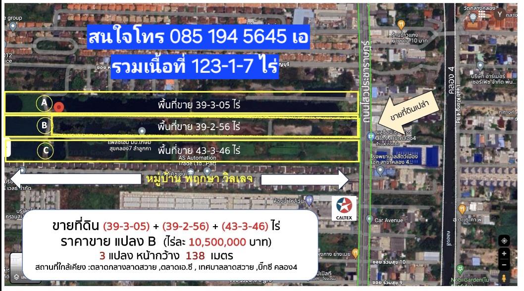 ขอเสนอที่ดินแปลงสวย ศักยภาพสูง หน้าติดถนน ไสวประชาราษฎร์ คลอง4 ลาดสวาย ลำลูกกา ปทุมธานี 3แปลงติดกัน เนื้อที่รวม 123-1-7ไร่ เอกสารโฉนด ราคาไร่ละ 10,500,000 บ. สนใจโทร 085 194 5645 เอ