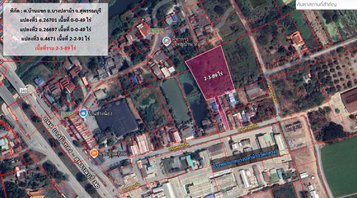 ขายที่ดินแปลงนี้ เนื้อที่ 2-3-89 ไร่ ติดโรงพยาบาลบางปลาม้า ( วัดกลาง )