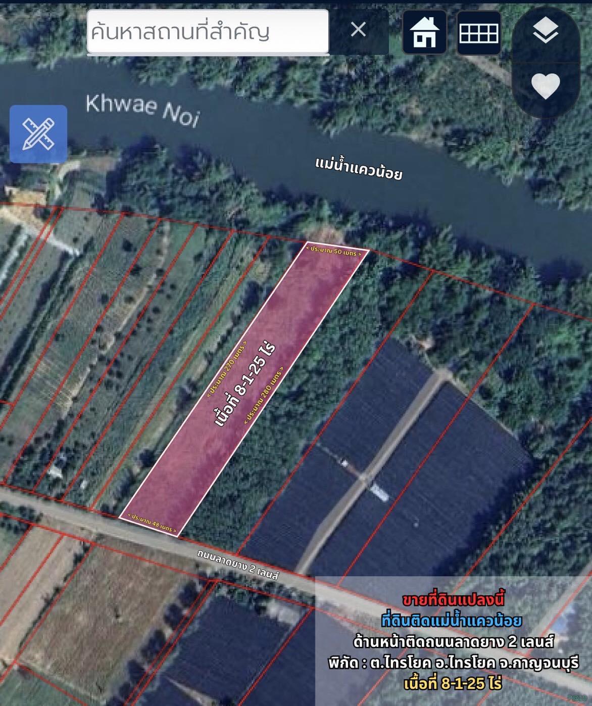 ขายที่ดินเปล่า เนื้อที่ 8-1-25 ไร่ ติดแม่น้ำแควน้อย ตารางวาละ 2,500 บาท