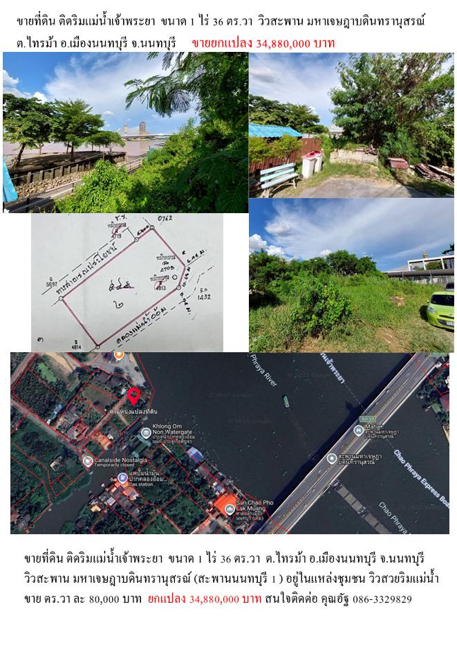 ขายที่ดิน ติดริมแม่น้ำเจ้าพระยา ขนาด 1 ไร่ 36 ตร.วา ต.ไทรม้า อ.เมืองนนทบุรี จ.นนทบุรี