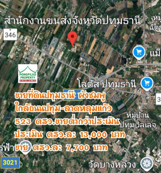 ขายต่ำกว่าประเมิน ที่ดินปทุมธานี 523 ตรว. ใกล้ถนนปทุม-ลาดหลุมแก้ว