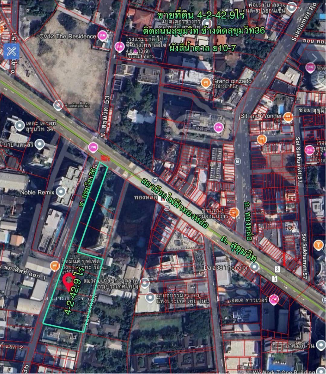 R69-064ที่ดิน4-2-42.9 ไร่ สุขุมวิท36. ติดถนนสุขุมวิท ด้านข้างติดซอยสุขุมวิท 36 หน้ากว้างติดถนนสุขุมวิท 14เมตรลึกไปตามซอย 239เมตร โอกาสดีของนักลง