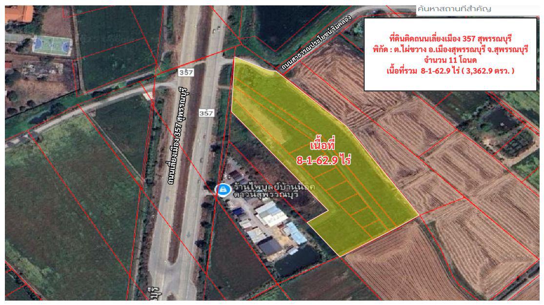 ขายที่ดิน 8-1-62.9 ไร่ ติดถนนเลี่ยงเมือง 357 สุพรรณบุรี ไร่ละ 2 ล้านบาท