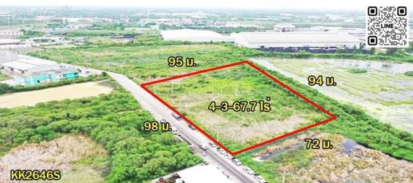 ที่ดิน ขนาด 4-3-67.7 ไร่ หน้ากว้าง 98 เมตร โดดเด่นเป็นสง่า วางแปลนสร้างโรงงาน/โกดังได้ง่าย ด้านหน้าติดถนนคอนกรีต กว้าง 12 เมตร รถเล็ก ใหญ่ เข้า-ออกได้สะดวก