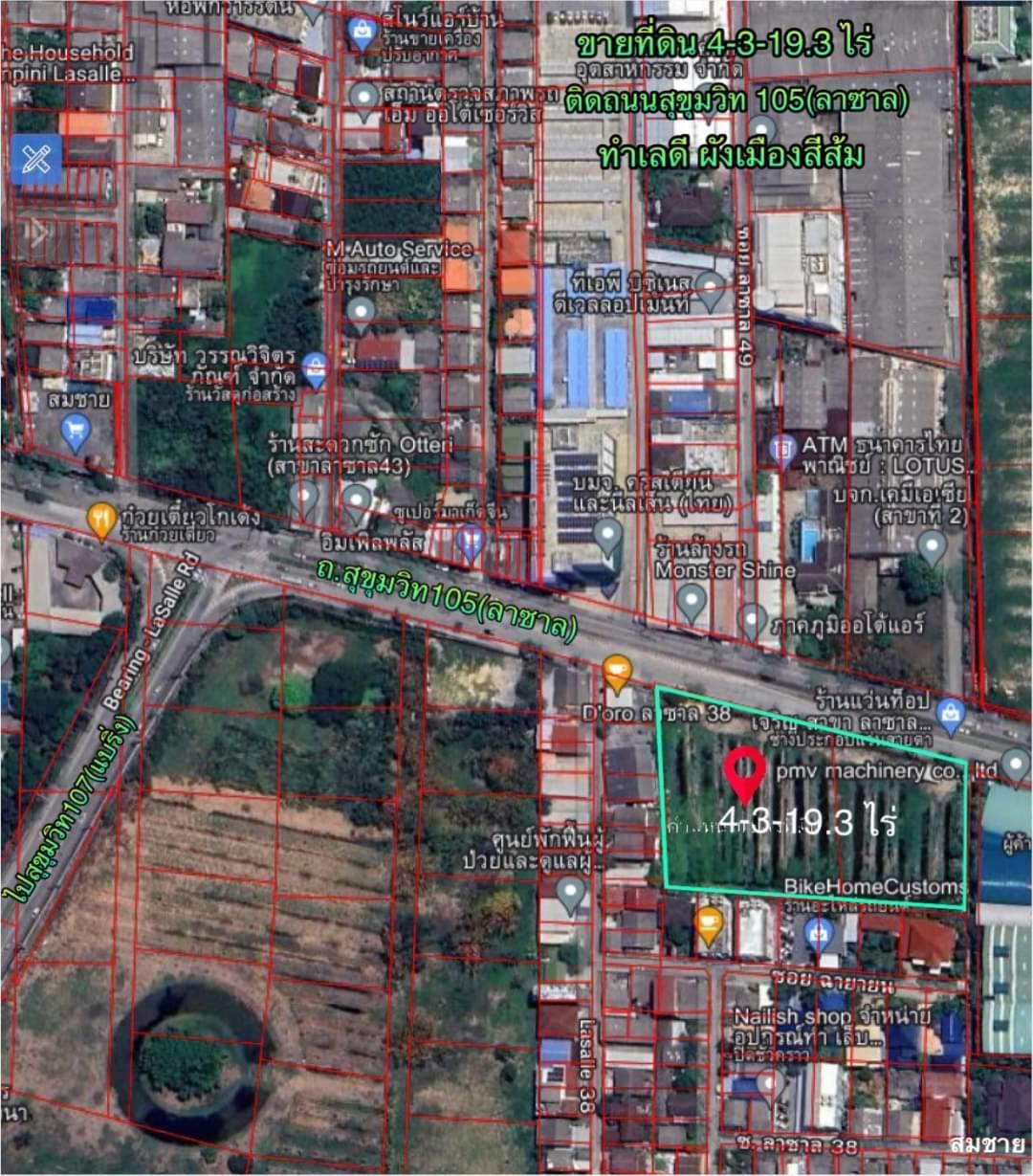 R69-63ขายที่ดิน 4-3-19.3 ไร่ ติดถนนสุขุมวิท105(ซอยลาซาล) ใกล้แยกไปแบริ่ง ผังเมืองสีส้ม ทำเลดี อยู่ระหว่างแนวรถไฟฟ้า2สายคือสายสีเขียวสุขุมวิทและสายสี