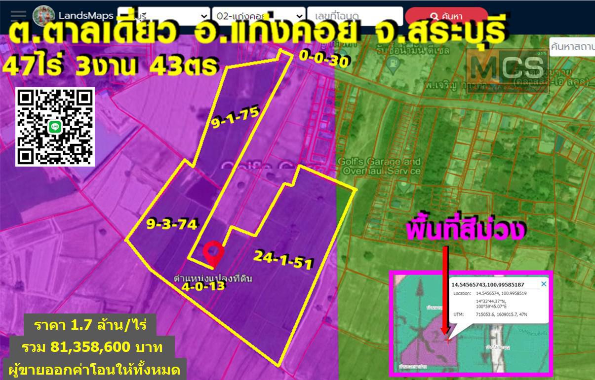 เนื้อที่ 47ไร่ 3งาน 43ตร.ว (ต.ตาลเดี่ยว อ.แก่่งคอย จ.สระบุรี) เหมาะสร้างโรงงาน,โกดังได้ 100% (มีไฟฟ้า,มีน้ำประปา) ผังเมืองเป็นพื้นที่สีม่วง