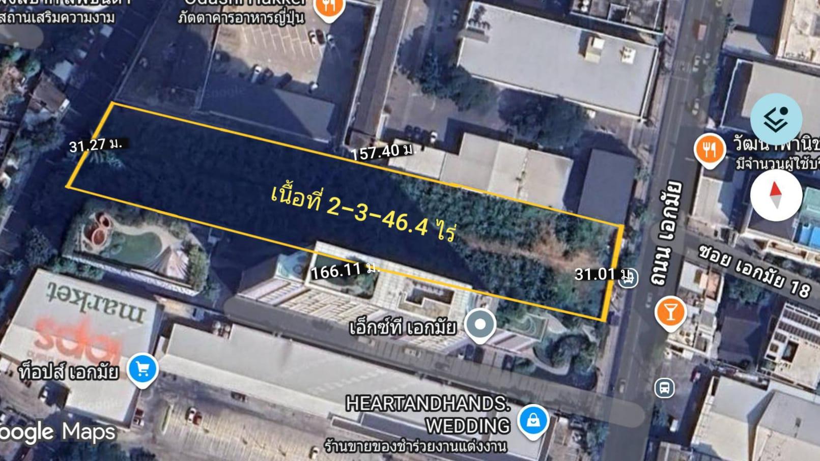 ขายที่ดินเปล่า 2-3-46.4 ไร่ (1,146.4 ตรว.) ติดถนนเอกมัย สุขุมวิท 63 แขวงคลองตันเหนือ เขตวัฒนา กรุงเทพๆ
