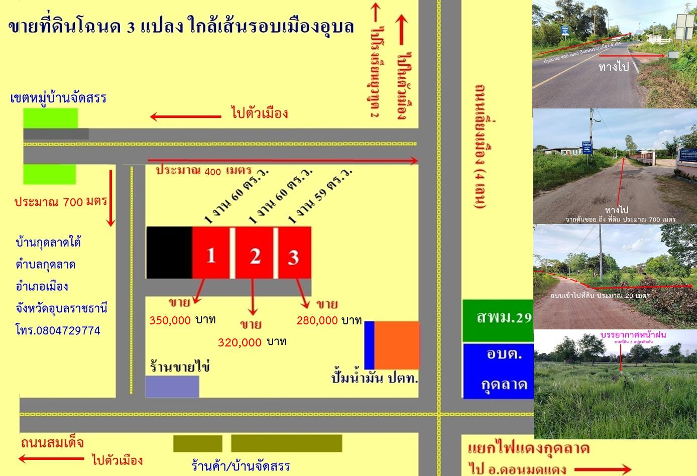 ขายที่ดินโฉนด อยู่ใกล้ถนน 4 เลน เส้นรอบเมือง อ.เมือง จ.อุบลราชธานี ทำเลที่ตั้ง หมู่ที่ 9 บ้านกุดลาดใต้ ต.กุดลาด อ.เมือง จ.อุบลราชธานี ที่ดินอยู่ใกล้เขตชุมชนบ้านจัดสรร ใกล้เส้นรอบเมือง ใกล้ถนนสี่เลน ใกล้เมือง มีสาธารณูปโภค ไฟฟ้า ประปา มีเพื่อนบ้านล้อมรอบ (เฉพาะบริเวณที่ดินกับที่ข้างเคียงเป็นทุ่งนาเก่าและที่เหลือเป็นบ้านคน) ปลอดภัย และบรรยากาศดีร่มรื่นน่าอยู่ คู่รักหนุ่มสาวอยากออกเรือน มีจำนวน 3 แปลง ดังนี้