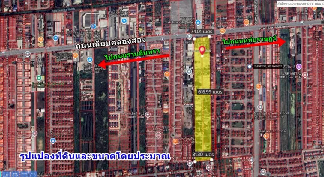 R69-55ขายที่ดิน 31-0-02 ไร่ ติดถนนเลียบคลองสองติดสำนักงานเขตคลองสามวา ที่ดินถมแล้ว ทำเลดี ผังเมืองสีเหลือง ย3-20 ถนนเลียบคลองสองกว้าง