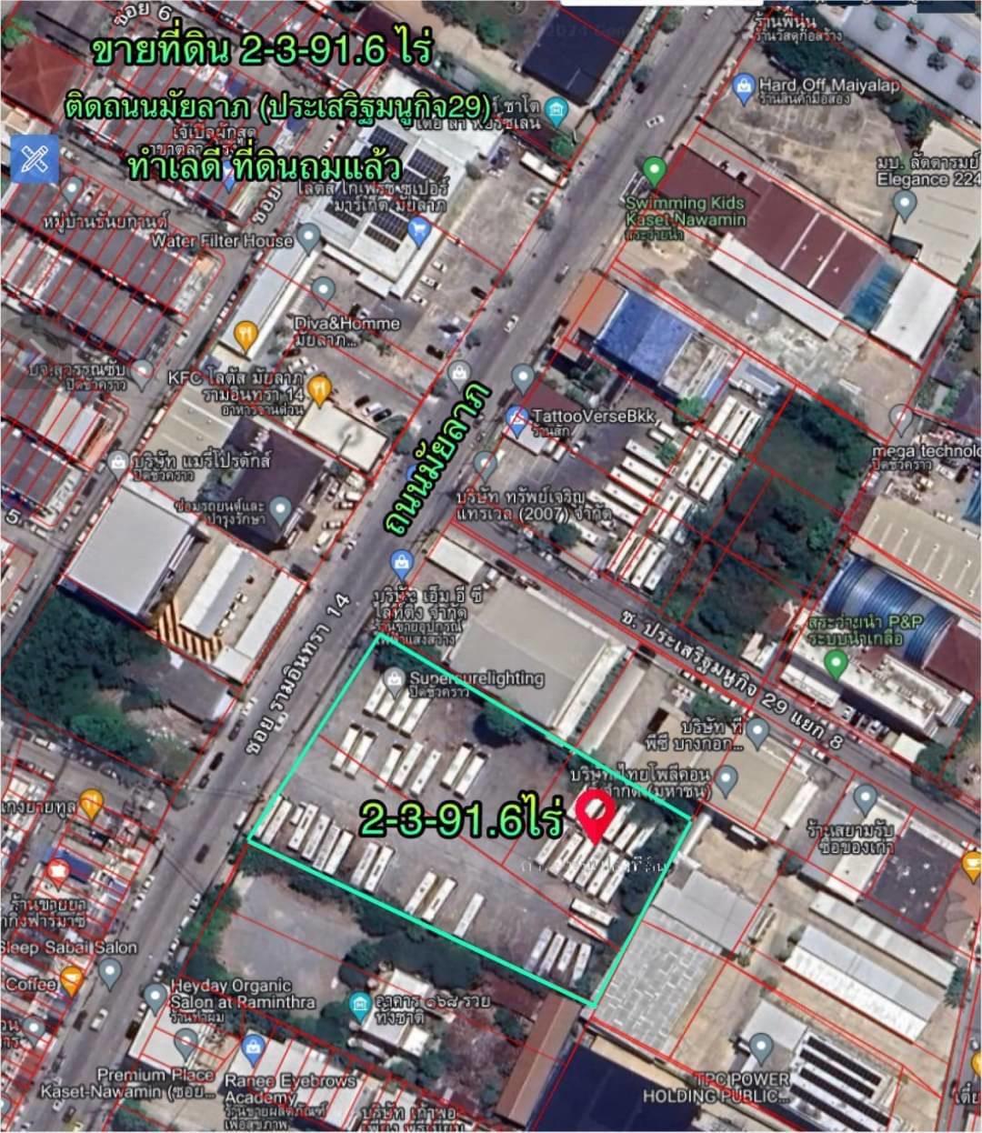 R068-014ขายที่ดิน2-3-91.6ไร่ติดถนนประเสริฐมนูกิจ29(ถนนมัยลาภ)ที่ดินถมแล้วทั้งแปลงทำเลดีปัจจุบันเป็นที่จอดรถทัวร์ ถนนมัยลาภกว้าง12เมตร ถนนมัยลาภ