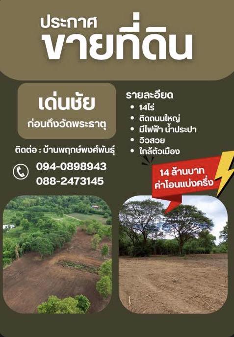 14 ไร่ ติดถนนใหญ่ ไฟฟ้า–ประปาพร้อม