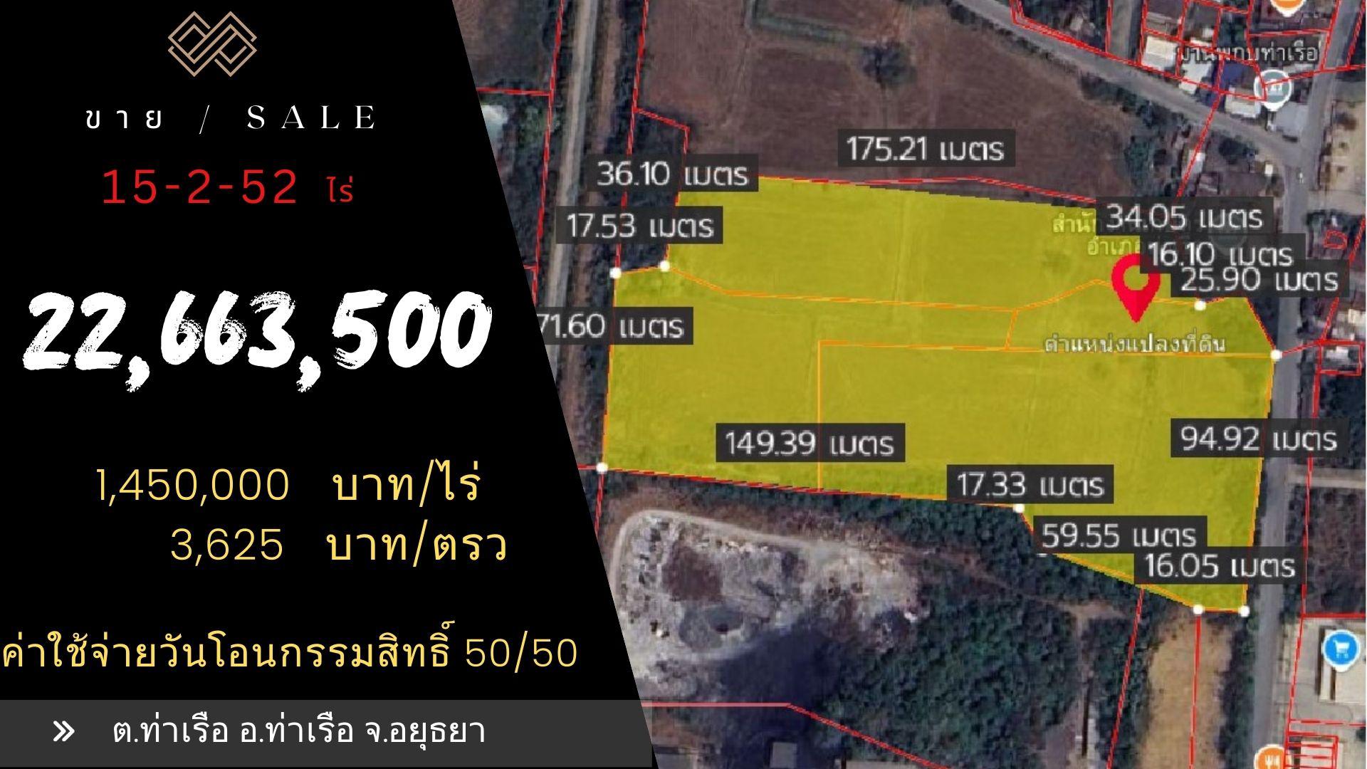 ขายที่ดินท่าเรืออยุธยา 15-2-52 ไร่ ติดถนน 2 ด้าน แปลงมุม