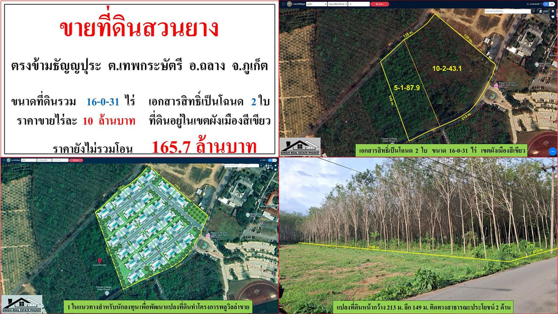 ขายที่ดินสวนยาง ขนาด 16-0-31 ไร่ ตรงข้ามธัญญปุระ ต.เทพกระษัตรี อ.ถลาง ภูเก็ต