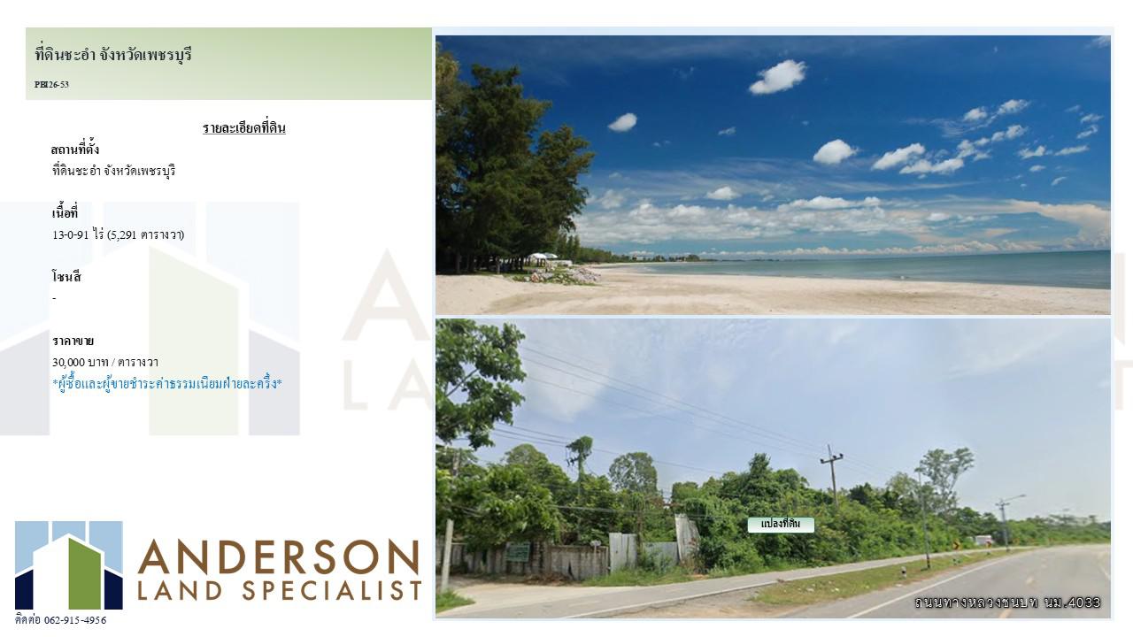 ขายที่ดินแปลงศักยภาพ ทำเลทองติดทะเลชะอำ จังหวัดเพชรบุรี เนื้อที่: 13-0-91 ไร่