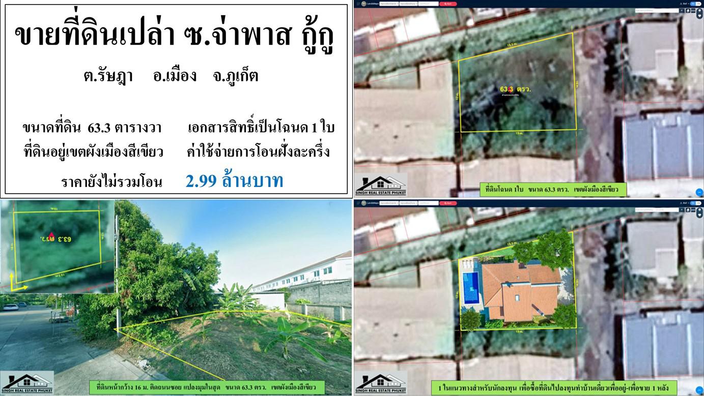 ที่ดินแปลงนี้เป็นโฉนด1ใบ ขนาด63.3ตรว. อยู่ที่กู้กู โดยเข้าไปทางซ.แม่ขำแล้วต่อด้วยซ.จ่าพาส ระยะทางรวมๆก็ประมาณ600ม.ก็ถึงแปลงที่ดิน โดยที่ดินอยู่แปลงมุมในมีหน้ากว้าง16ม.ติดถนนคสล. สภาพเป็นที่ราบมีหญ้าขึ้นรกทั่วแปลง ที่ดินเป็นรูปสี่เหลี่ยมคางหมูขนาด63.3ตรว.เหมาะมากที่จะสร้างบ้านเดี่ยว 1หลัง หรือสร้างบ้านแฝดขายได้2หลัง จากพิกัดแปลงที่ดินสามารภไปห้างบิ๊กซีราชภัฎ-หรือไปราชภัฎภูเก็ต-หรือไปห้างซุเปอร์ชีฟก็ได้ไม่เกิน5นาทีก็ถึง หน้าถนนกู้กูมีแหล่งขายอาหารกินเยอะแยะมากมายให้เลือก เข้าออกตัวเมืองเทศบาลก็ทำได้สะดวก.