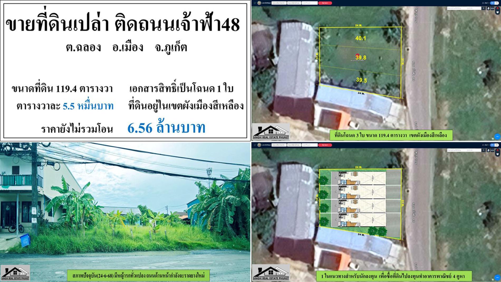 ที่ดินแปลงนี้ตั้งอยู่ถ.เจ้าฟ้า48 ใกล้ๆโรงเรียนนานาชาติBCIS โดยมีหน้ากว้าง 21ม. ลึกหลัง24ม. เป็นโฉนดรวม3ใบ ขนาดและพิกัดที่ดินเหมาะมากที่จะลงทุนทำอาคารพาณิชย์ประมาณ4คูหาเพื่อประกอบธุรกิจย่านถนนซอยนี้ หรือจะสร้างอพาร์ทเม้นท์20-30ห้องก็เหมาะมาก การเดินทางสะดวกและมีสาธารณูปโภคครบทุกอย่าง นักลงทุนท่านใดมองหาที่ดินย่านถนนซ.เจ้าฟ้า48แปลงเล็กๆเพื่อลงทุนก็ขอแนะนำที่ดินแปลงนี้ไว้พิจารณา...